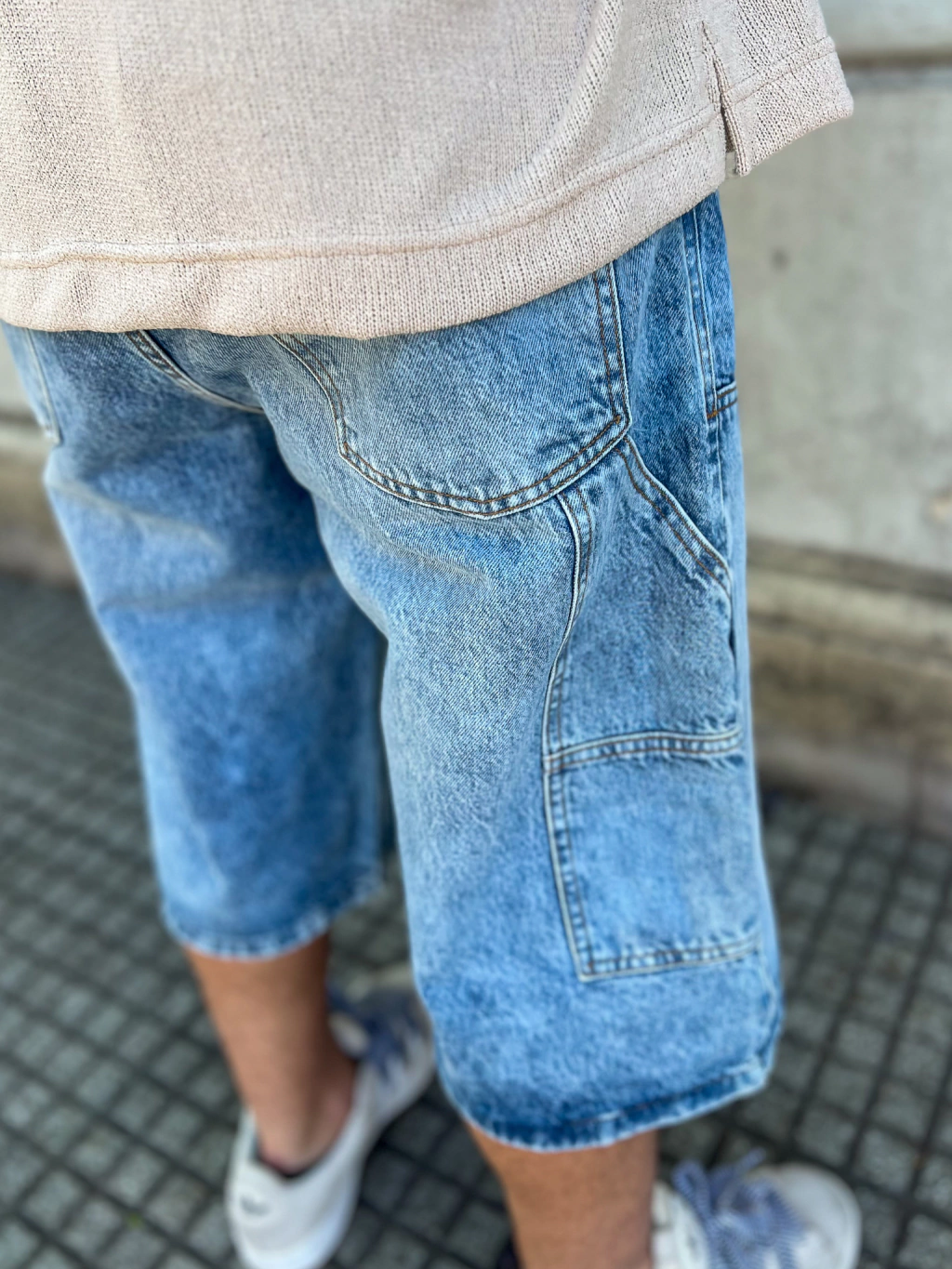 - Bermuda carpintero confeccionada en denim rígido. Corte baggy de ajuste holgado y piernas anchas.