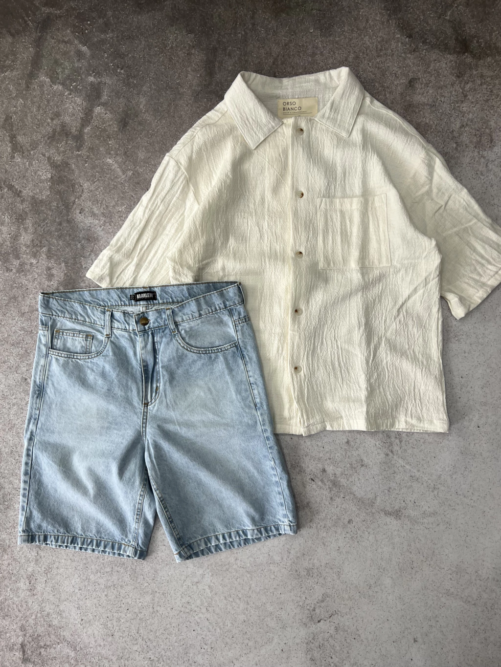 El Outfit Coast Mirage combina la Camisa Kaia Crudo con la Bermuda Mom Guinness Celeste, logrando un look fresco, moderno y con mucha onda veraniega.
